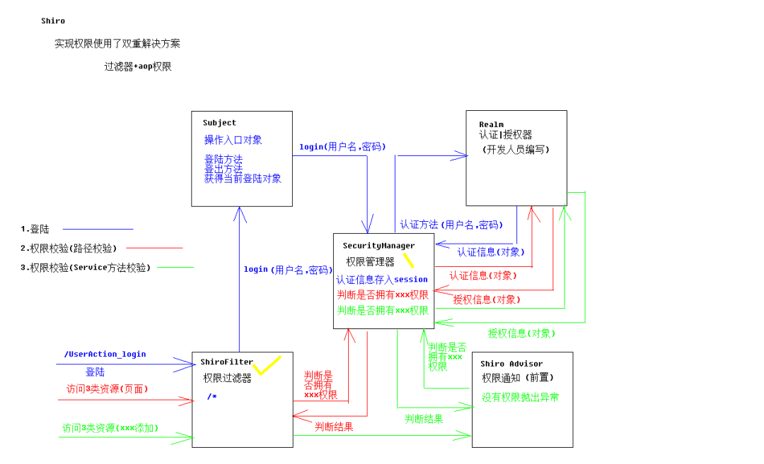 登录属于一类资源直接放行到——------>userActon中(userAction中调用执行subject对象(使用入口是一个操作入口对象,里面有登陆方法,登出方法,获取当前对象方法)的登陆方法subject.login方法(携带着用户名,密码)