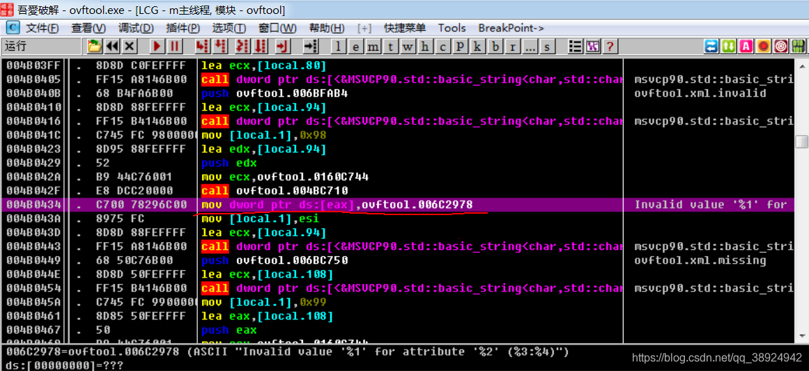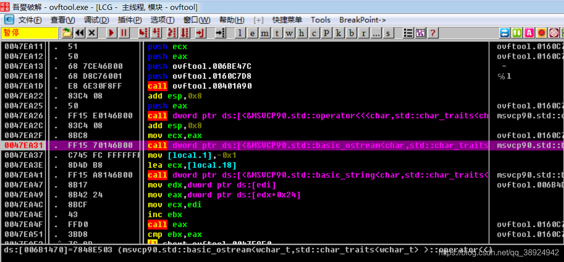- 由于知道了打印函数,所以直接在打印函数上下断点,待程序断在 “Invalid value” 处的时候,再激活断点运行,终于找到了在 std::basic_string 之后的 std::basic_ostream 打印函数