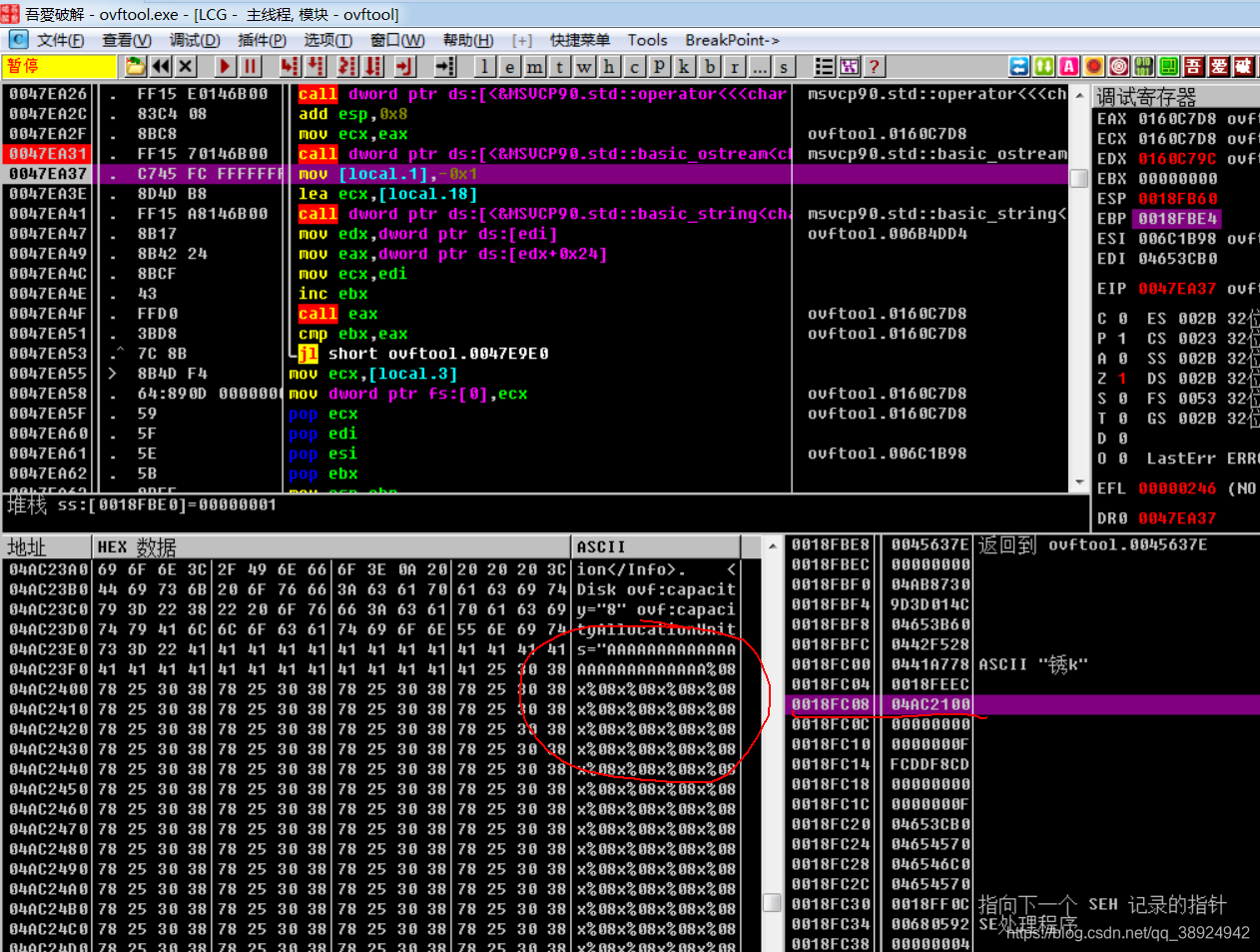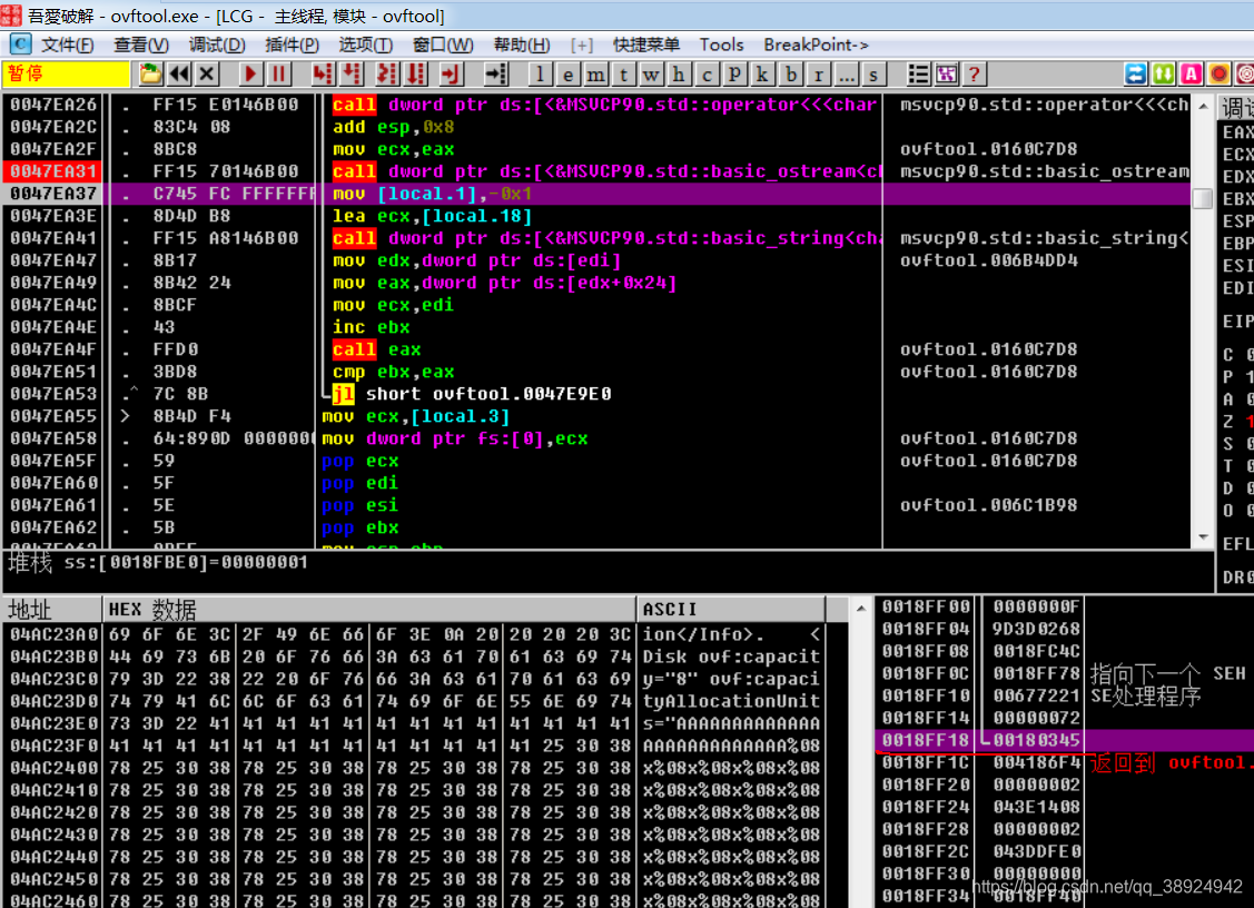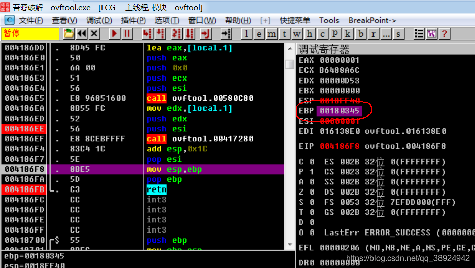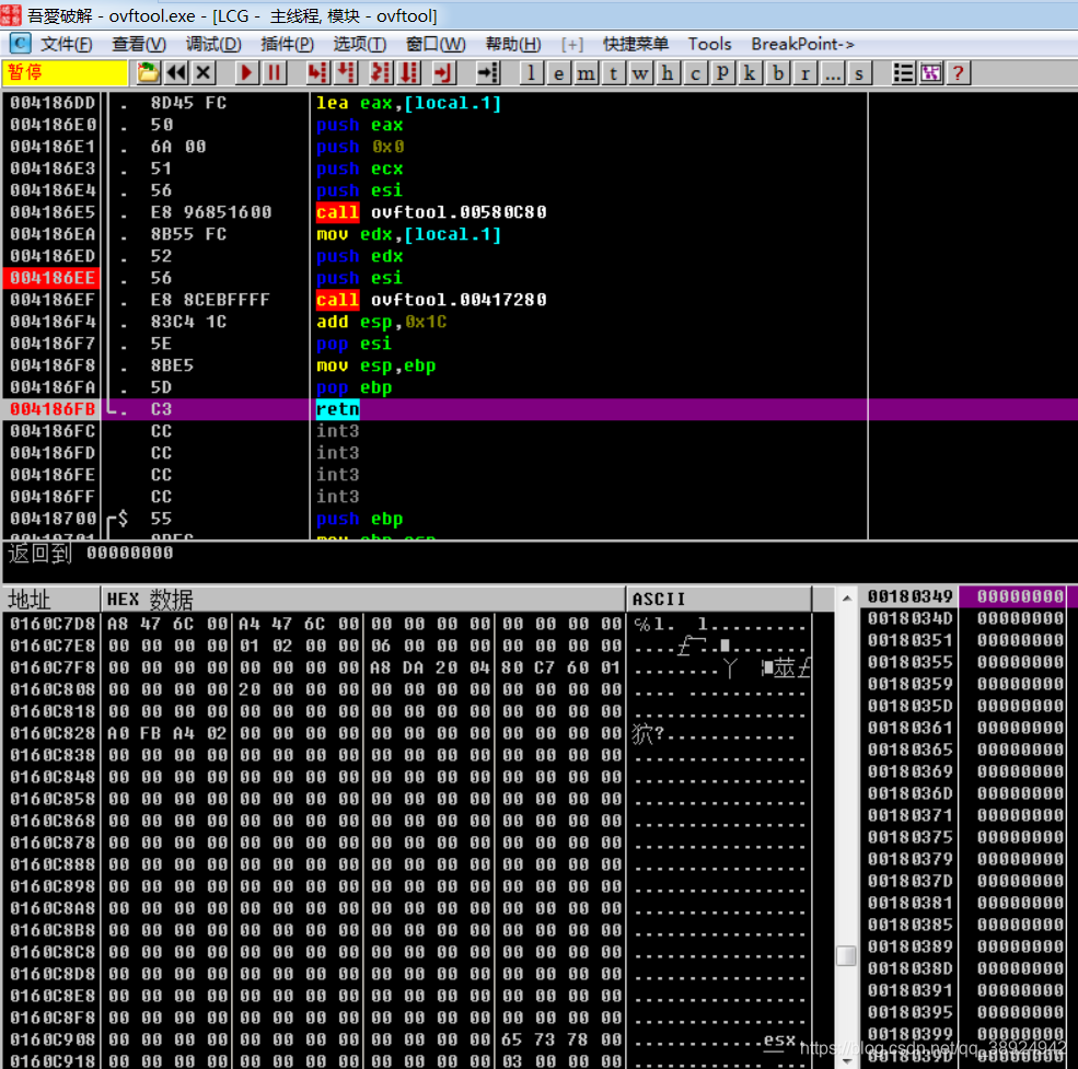 - 下面需要找到 ebp 是何时被修改的,结果是在 ovftool.00417280 函数的结尾把栈上的数据 0x 00180345 pop 到 ebp 中,记下此时栈顶的位置是 0x0018FF18