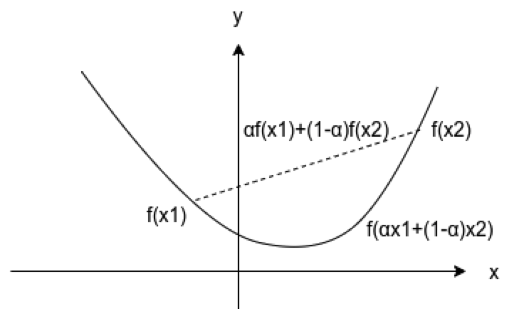 ① \(Ω\)为凸集,如果对任意的\(x_1,x_2 \in Ω\)以及每一个\(α(0\leqslant \alpha \leqslant 1)\),有 \(f(αx_1+(1-\alpha)x_2)<=αf(x_1) + (1-α)f(x_2)\),则称定义在凸集上的函数\(f\)是凸的(convex)。