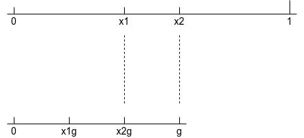 (b) 选择\(x_1\)和\(x_2\)使得不管在下一步中使用哪种选择,\(x_1\)和\(x_2\)都是下一步中的某个采样点。为了简化讨论,我们以\([a,b]=[0, 1]\)为例子,可以推广到其他区间。即要求\(x_1 = 1 - x_1\)(关于区间中心对称),\(x_1 = x_2^2\)。如下图所示,如果新区间为\([0, x_2]\),标准(b)保证原始的\(x_1\)将会在下个区间中变为\(x_2\),因而仅仅需要进行依次函数求值,即\(f(x_1g)\),(这里\(g\)为\(x_2\)的初始值)同样,如果新的区间为\([x_1, 1]\),则\(x_2\)变为新的"\(x_1\)"。这种重用函数求值的能力意味着在第一步后,每步仅需要目标函数的单次求值。每轮迭代演示如下: