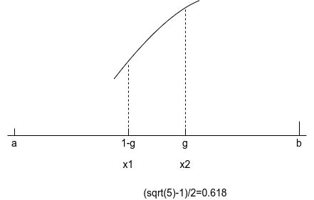 根据上图所示,我们需要选择黄金分割搜索的比例,即\(x_2\)所放置的位置。 旧区间和新区间的比例为\(1/g = (1+ \sqrt{5})/2\),即黄金分割。这样,每轮放置的\(x_1 = 1-g=(1+ \sqrt{5})/2,x_2 = g = ( \sqrt{5} − 1)/2=0.618\),如下图所示: