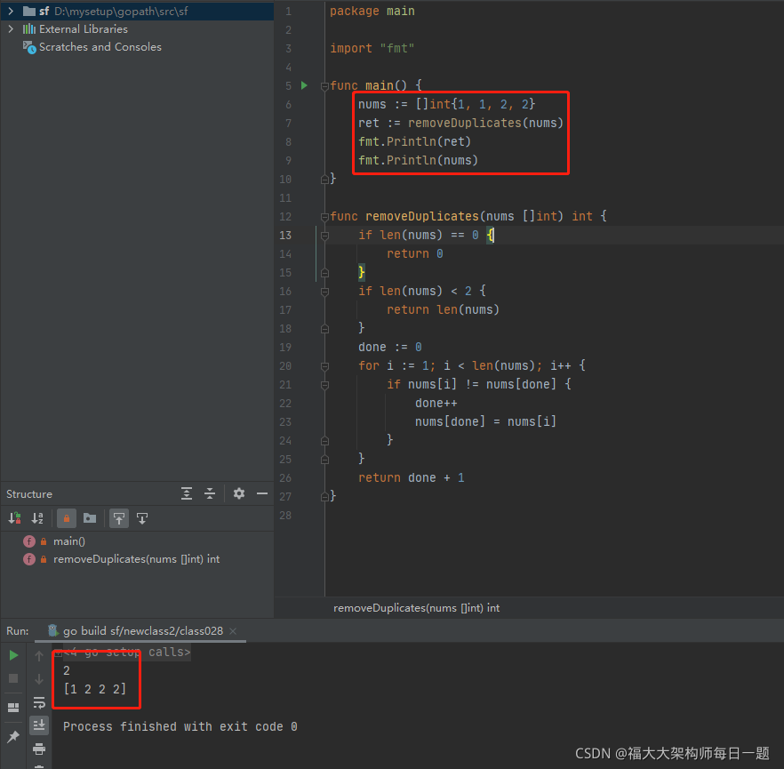 2021-09-20:给你一个有序数组 nums ,请你 原地 删除重复出现的元素,使每个元素 只出现一次 ,返回删除后数组的新长度。不要使用额外的数组空间,你必须在 原地 修改输入数组 并在使用 O(1) 额外空间的条件下完成。示例 1:输入:nums = [1,1,2]。输出:2, nums = [1,2,_]。