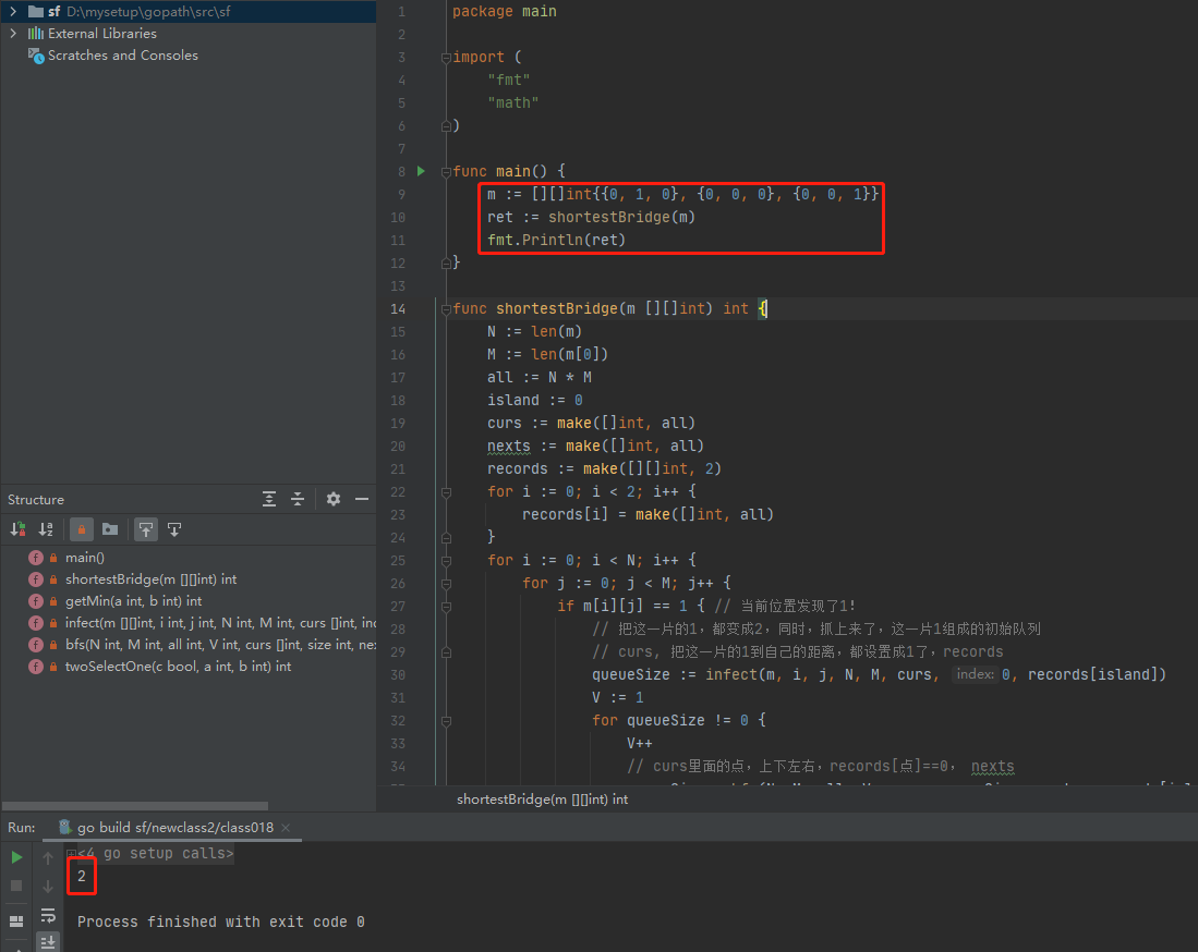 2021-07-28:最短的桥。在给定的二维二进制数组 A 中,存在两座岛。(岛是由四面相连的 1 形成的一个最大组。)现在,我们可以将 0 变为 1,以使两座岛连接起来,变成一座岛。返回必须翻转的 0 的最小数目。(可以保证答案至少是 1 。)