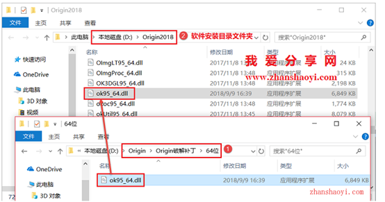 返回初始软件安装包,双击打开Origin破解补丁/64位文件夹,将ok95_64.dll文件复制粘贴到你安装软件安装目录文件夹下【两个破解文件】,点击替换