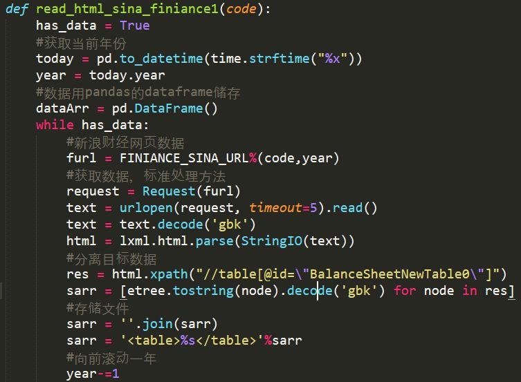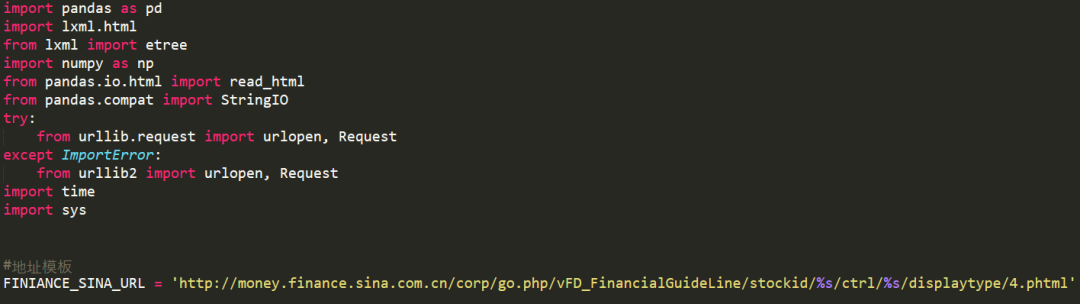 import pandas as pdimport lxml.htmlfrom lxml import etreeimport numpy as npfrom pandas.io.html import read_htmlfrom pandas.compat import StringIOtry: from urllib.request import urlopen, Requestexcept ImportError: from urllib2 import urlopen, Requestimport timeimport sys#地址模板FINIANCE_SINA_URL = 'http://money.finance.sina.com.cn/corp/go.php/vFD_FinancialGuideLine/stockid/%s/ctrl/%s/displaytype/4.phtml';def read_html_sina_finiance1(code):