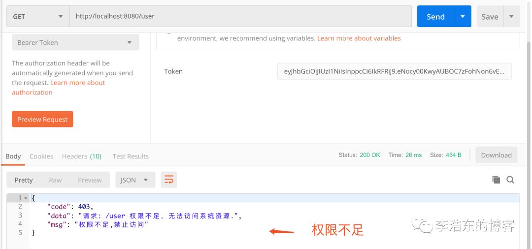 权限测试 访问/use 接口 由于test用户角色是普通用户没有权限去访问
