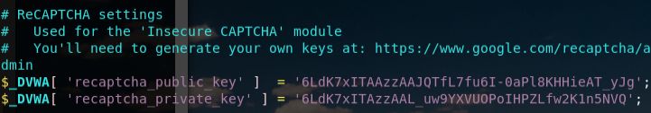 配置$_DVWA[ 'recaptcha_private_key' ] = '6LdK7xITAzzAAL_uw9YXVUOPoIHPZLfw2K1n5NVQ';