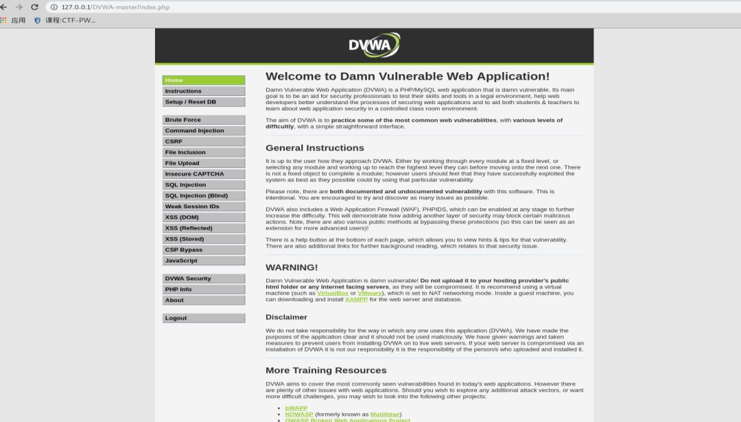 DVWA具有十个模块:分别是 Brute Force(暴力破解)、Command Injection(命令行注入)、CSRF(跨站请求伪造)、File Inclusion(文件包含)、File Upload(文件上传)、Insecure CAPTCHA(不安全的验证码)、SQL Injection(SQL注入)、SQL Injection(Blind)(SQL盲注)、XSS(Reflected)(反射型跨站脚本)、SXX(stored)(存储型跨站脚本)。