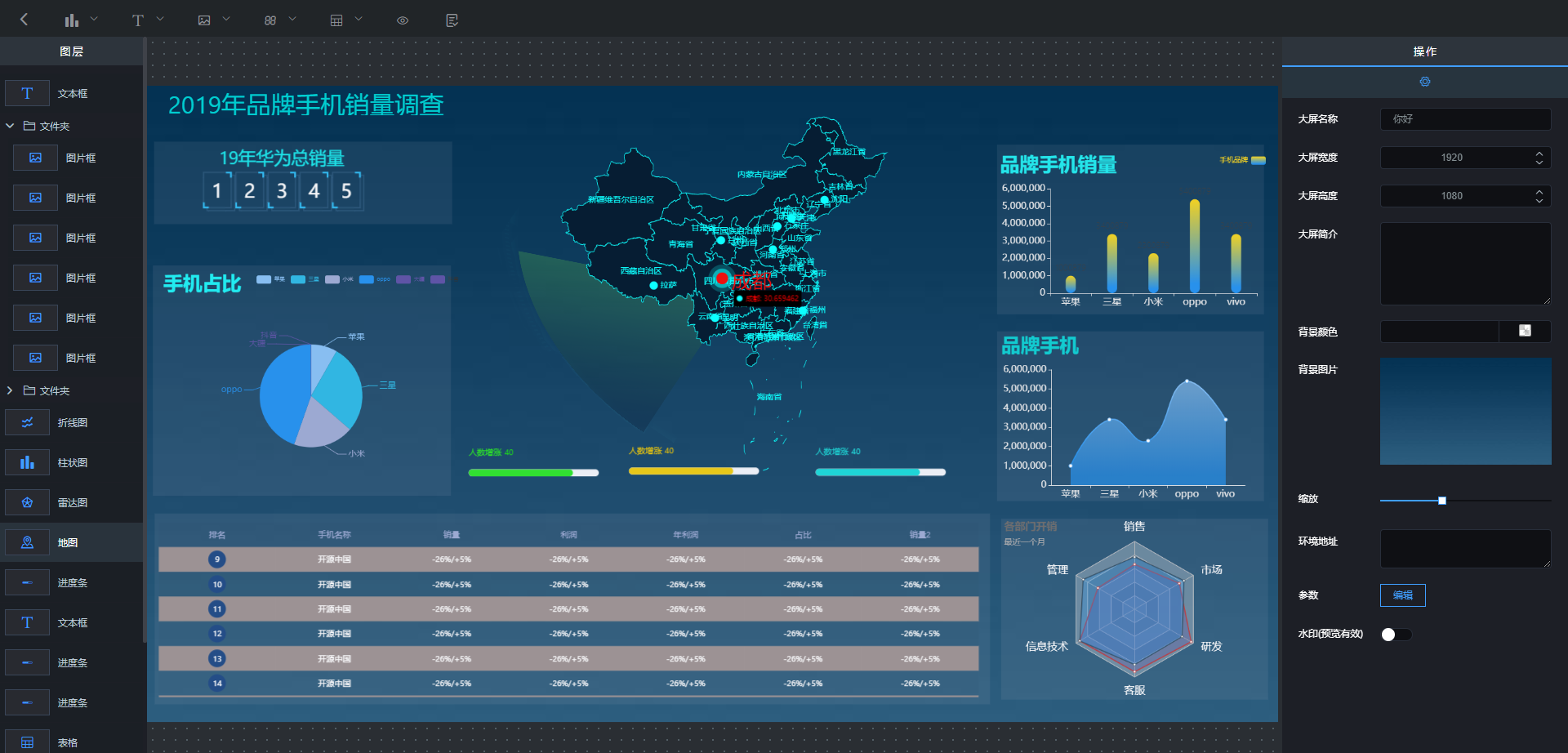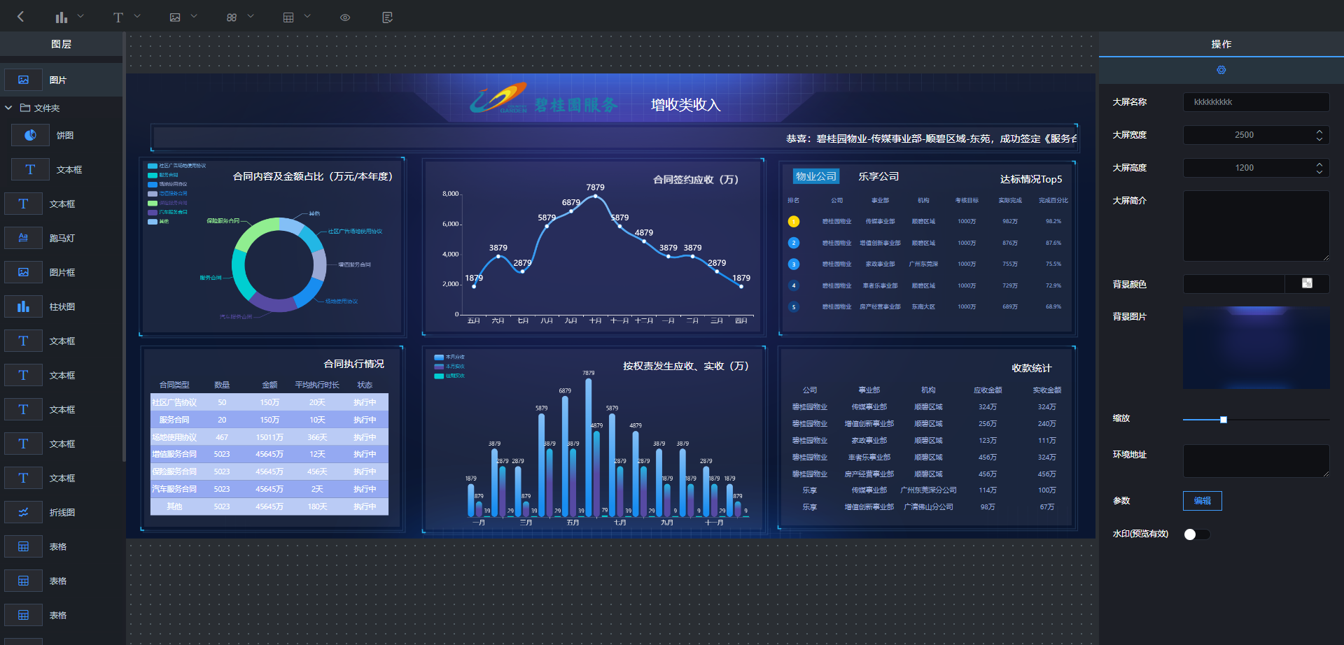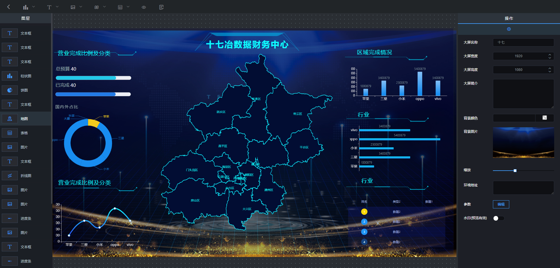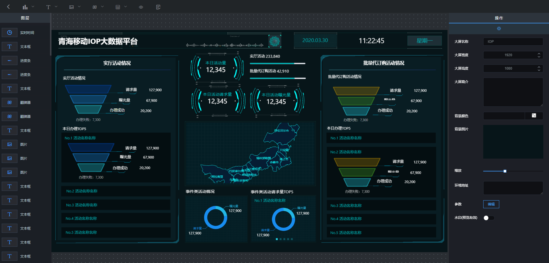 LeaRun商业智能插件是基于浏览器的、用于配置数据可视化大屏的工具平台。它提供了丰富的可视化设计组件,通过简单的点击、拖拽等操作,即可进行图表布局的调整,只要几分钟就可以配置出一页实用且炫酷的可视化大屏。
