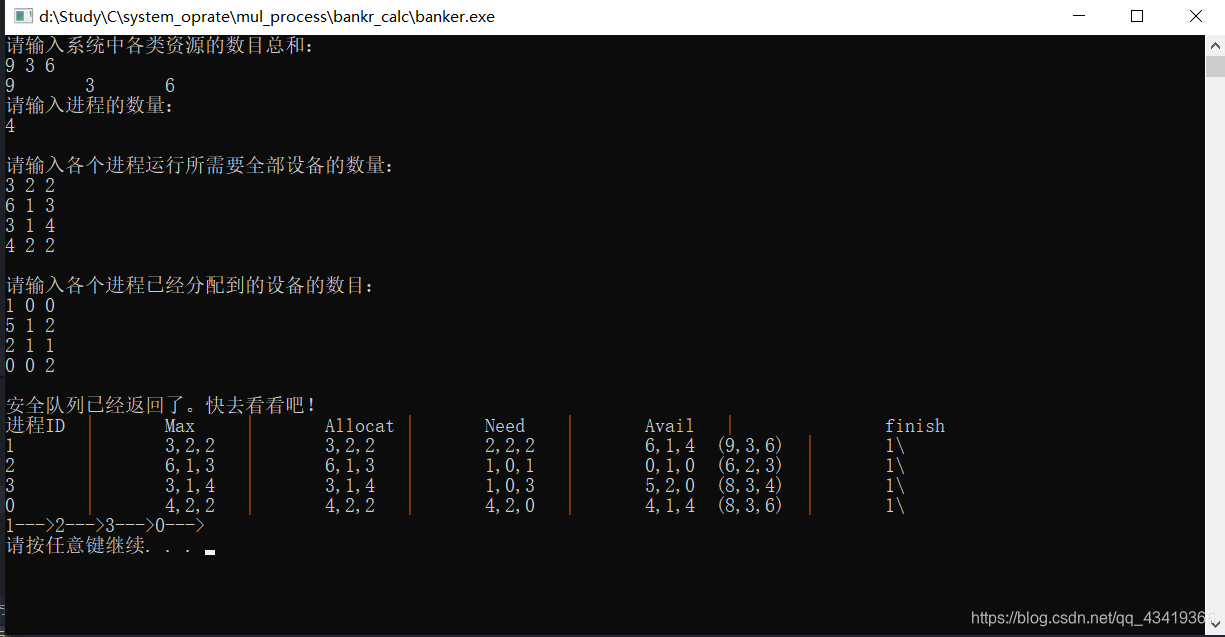 我们需要做的就是在有限的资源下,是否有一个分配顺序,可以使得全部进程都可以获得资源并运行,如果可以则返回一个安全队列,如果不可以,则说明有风险,系统可能会陷入死锁。
