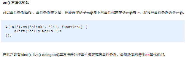 因为普通注册事件方法的不足,jQuery又创建了多个新的事件绑定方法bind() / live() / delegate() / on()等,其中最好用的是: on()