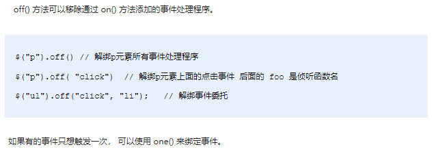 当某个事件上面的逻辑,在特定需求下不需要的时候,可以把该事件上的逻辑移除,这个过程我们称为事件解绑。jQuery 为我们提供 了多种事件解绑方法:die() / undelegate() / off() 等,甚至还有只触发一次的事件绑定方法 one(),在这里我们重点讲解一下 off() ;