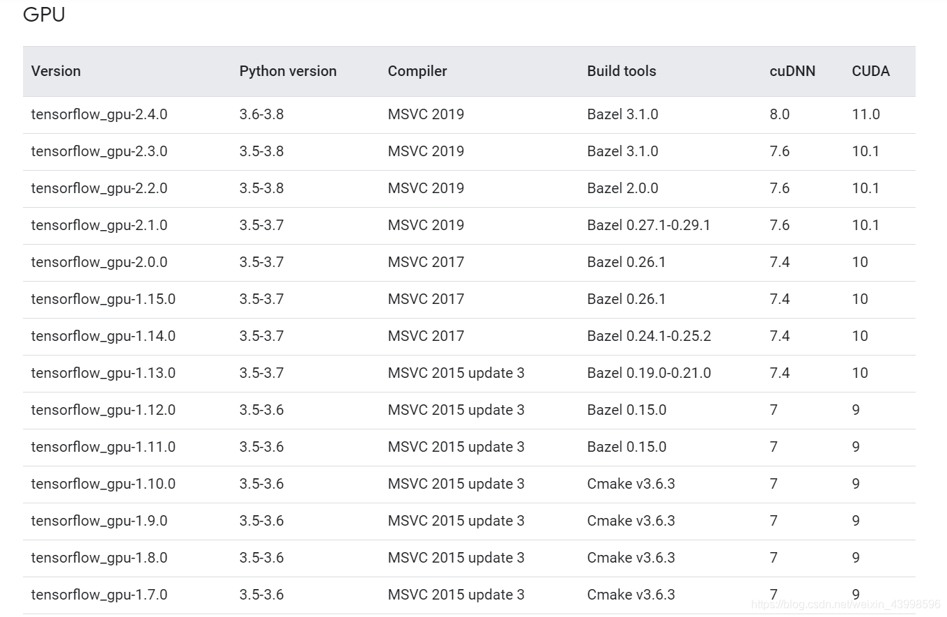 安装tensorflow各个版本时,一定要参考官网上的表,最好是参考英文网站,中文网有时更新不够及时。