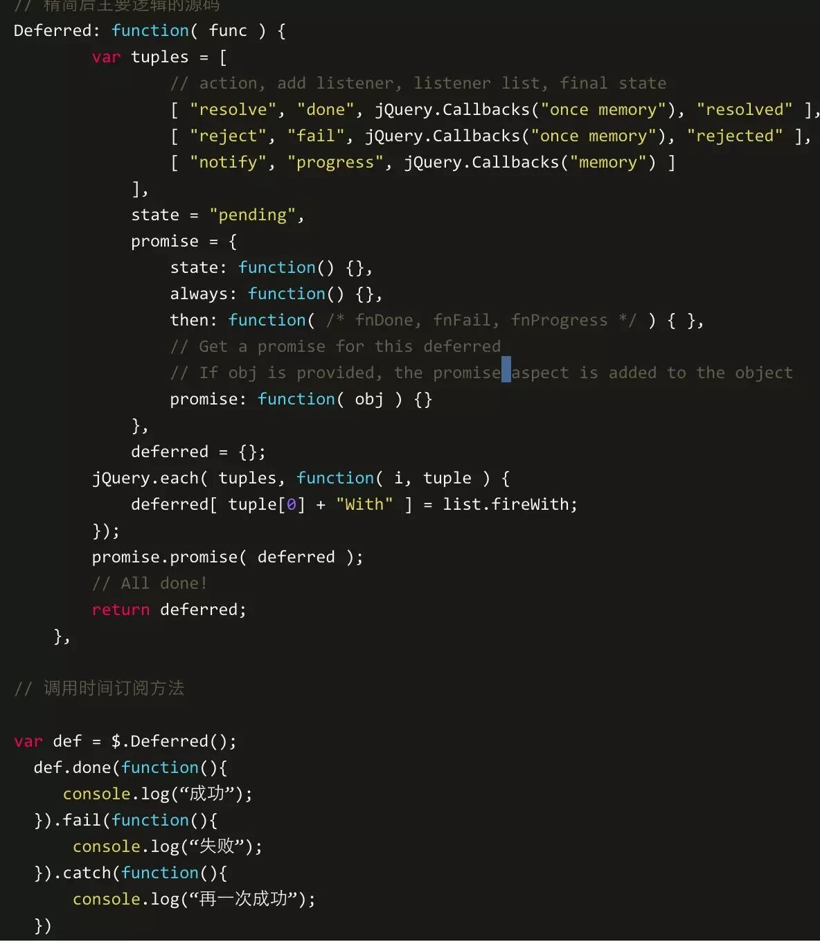 我们先来看看jquery的Promise是怎样实现的。我们看下jquery的Deferred实现源码: