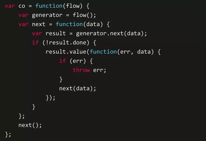 我们小结一下通过Generator进行流程控制的特点。 - 每个异步方法都需要标准化为yield关键字能接受的方法,使我们有机会注入特殊逻辑,这个过程被称为thunkify。 - 需要巧妙地将异步调用执行完成得到的结果通过.next()传递给下一段流程。 - 需要递归地将业务逻辑执行完成。