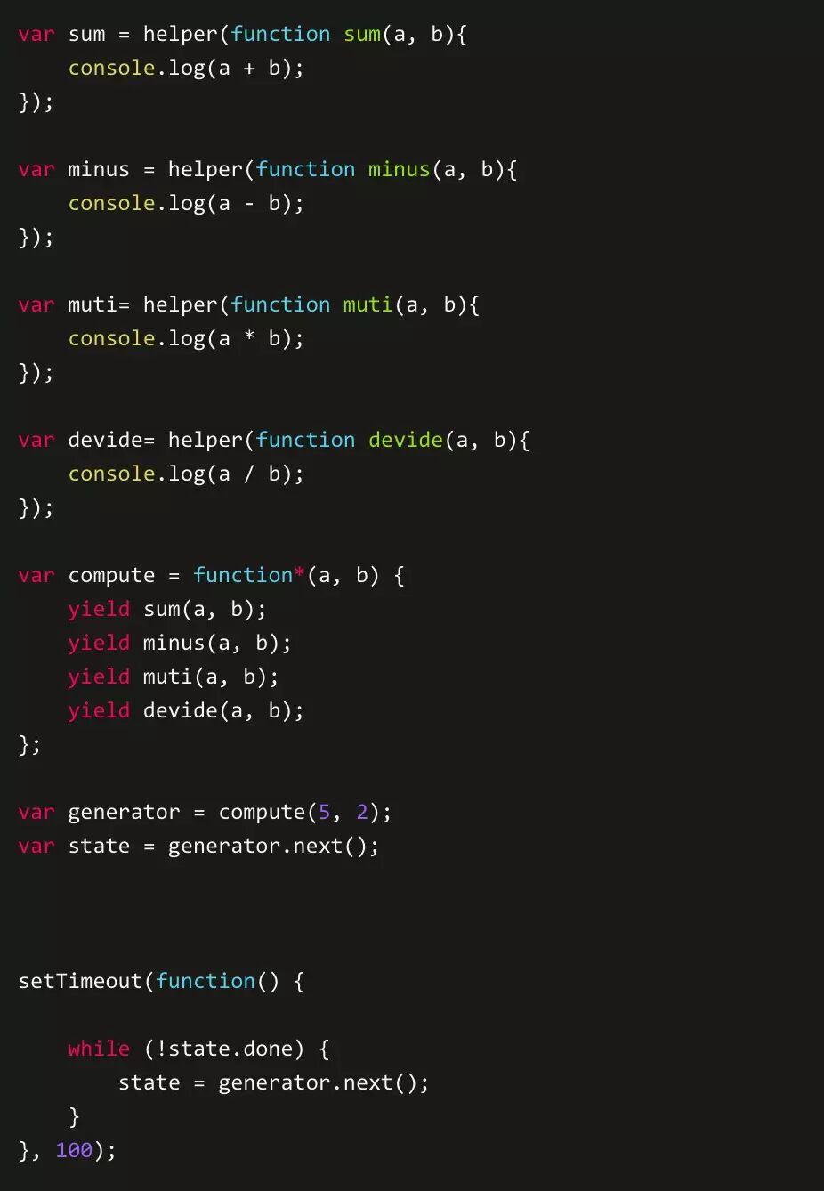 不难发现它的运行过程,generator函数运行到yield时会停止,等待下一个next()方法调用让它继续执行。我们改下成为异步方法,异步我们需要借助高阶函数