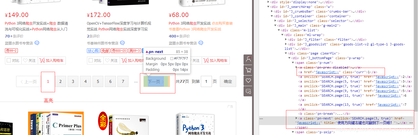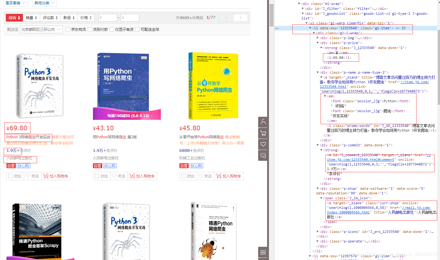 6.能正常翻页就简单很多了,开始抽取需要的商品信息,搜索不同的关键词,页面的布局会有变化,需要重新写定位商品信息